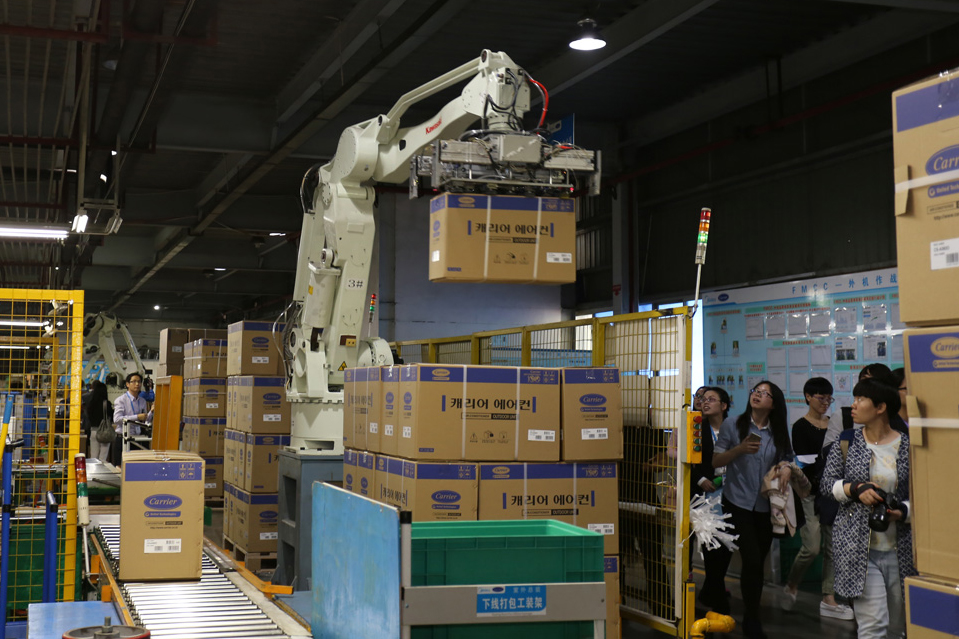 現(xiàn)在的空調(diào)生產(chǎn)線,出現(xiàn)的已不再是擁擠忙碌得跟陀螺似的產(chǎn)業(yè)工人。因為不少的“機器手”、“機器人”的出現(xiàn),勞動密集型的家電制造工廠被賦予了全新的“科技感”和“智能化”的色彩。在空調(diào)室內(nèi)、外機總裝線體的末端,裝箱、打包等繁重環(huán)節(jié),早已被機器人所取代。當(dāng)成品從生產(chǎn)線上完成之后,也是通過機器手直接搬運到流轉(zhuǎn)板上。